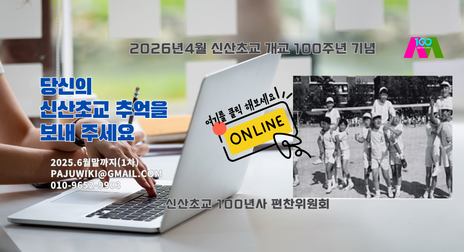 2026년 4월 7일 신산초등학교 개교 100주년을 맞아 신산초교 100주년 기념사업추진위원회는 동문들의 추억의 스토리를 모집합니다. 초등학교 시절의 추억이나 에피소드, 특별한 사진, 학창 시절의 기록물 등을 접수하며 ‘신산초교 100년사’에 수록할 예정입니다.