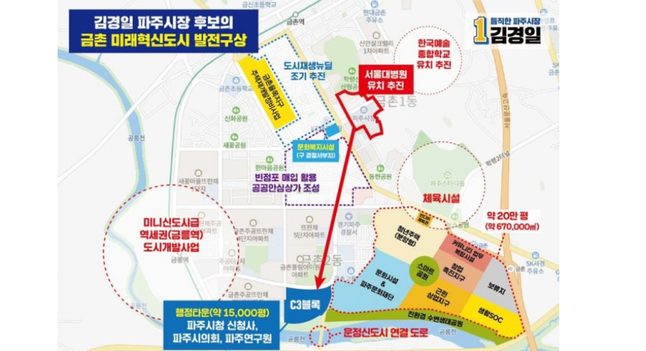 2022.5.23일 후보자 블로그에서는 C3블록에 파주시청 신청사와 파주시 의회, 파주연구원을 건립하고 이전되는 구청사에는 서울대 병원을 유치하겠다고 공약했다