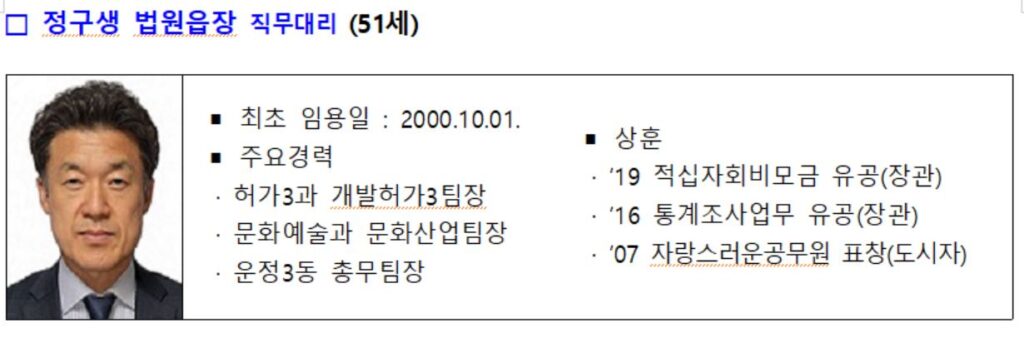 | 건축주택국 허가과 | 지방행정주사 | 정구생 | 법원동장 직무대리 |