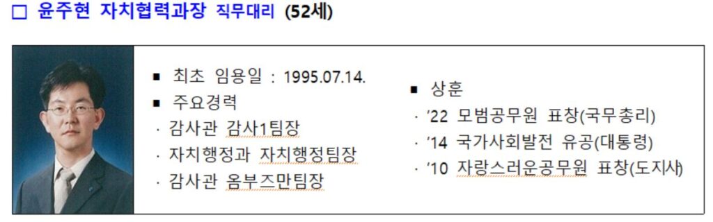 | 감사관 | 지방행정주사 | 윤주현 | 행정안전국 자치협력과장 직무대리 |