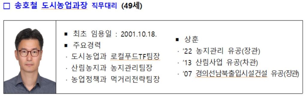 | 농업기술센터 도시농업과 | 지방농업주사 | 송호철 | 농업기술센터 도시농업과장 직무대리 |
