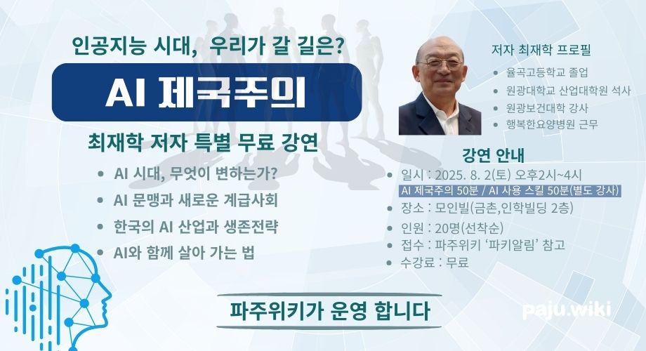 파주 출신 최재학 저자의 “AI 제국주의” 출판을 기념하여 파주위키가 저자를 초빙하여 무료 강연을 개최합니다. 강연은 2025. 8.2일(토)로 금촌 모인빌에서 진행되며 회의실 공간이 협소한 관계로 참석자를 전체 20명으로 제한합니다.