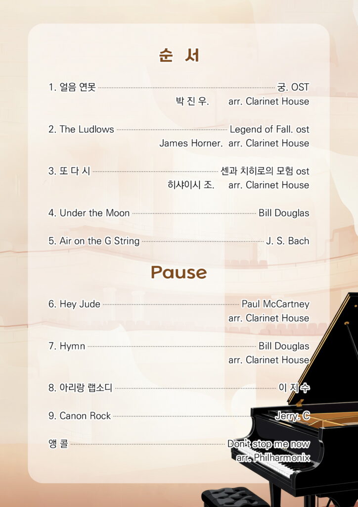 이번 공연의 모든 곡은 Clarinet House에서 편곡한 작품들로, 클래식과 대중음악의 조화로운 만남을 선사할 것으로 기대된다.