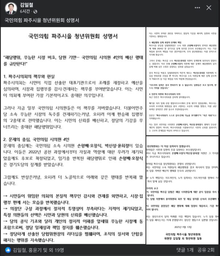 2025.9.13일 김일철 국민의힘 파주시을 청년위원회 위원장과 청년위원 일동은 파주시의회에서 ‘의회민주주의 수호 결의안’을 반대한 국민의힘 소속의원 4명에 대하여 규탄 성명서를 페이스북에 발표했다. -파주위키-