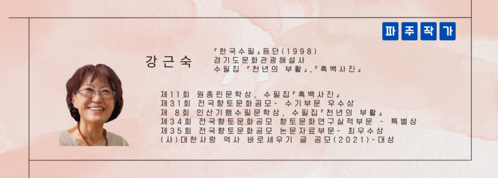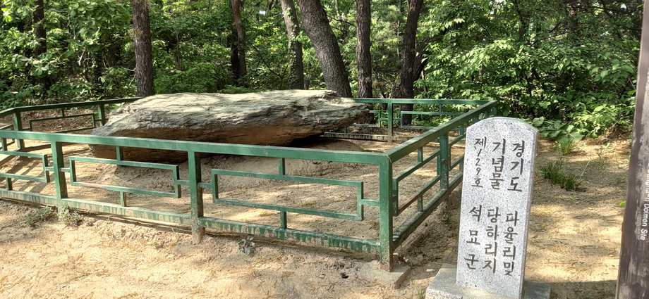 초록이 출렁이는 날, 월롱면 덕은리 고인돌을 보러 갔다. 국가 사적 제148호 ‘옥석리 유적’에는 산비탈에 아무렇게나 뒹구는 고인돌과 보호막 안에 온전한 형태로 남아있는 고인돌이 산등성이를 따라 이어진다. 덕은리 고인돌은 고창이나 화순지역처럼 크지는 않지만, 청동기 시대 탁자식 구조를 가장 잘 보여주는 고인돌이 산줄기에 퍼져있었다. 산등성이 맨 위쪽 보호막 안에 세 기의 작은 고인돌은 마치 한 가족이 둘러앉은 것처럼 다정해 보인다. 산 아래 움집터에서 토기, 간돌칼, 돌도끼가 출토되었고, 화덕자리에서 발견된 숯을 방사성탄소연대측정 결과 기원전 7세기 전후 유적으로 밝혀졌다. 인적 없는 능선을 따라가며 산쑥을 뜯다가 이곳에서 가장 큰 개석식 고인돌 또 하나를 발견했다.
