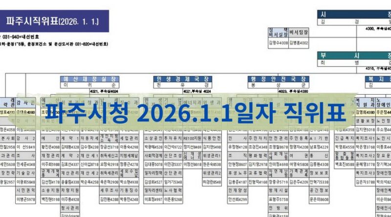 자세히 보기지난 2025년 12월22일 파주시 인사발령에 따라 2026.1.1일자 6급 이상 직위표이다. 직위표 다운로드 하기