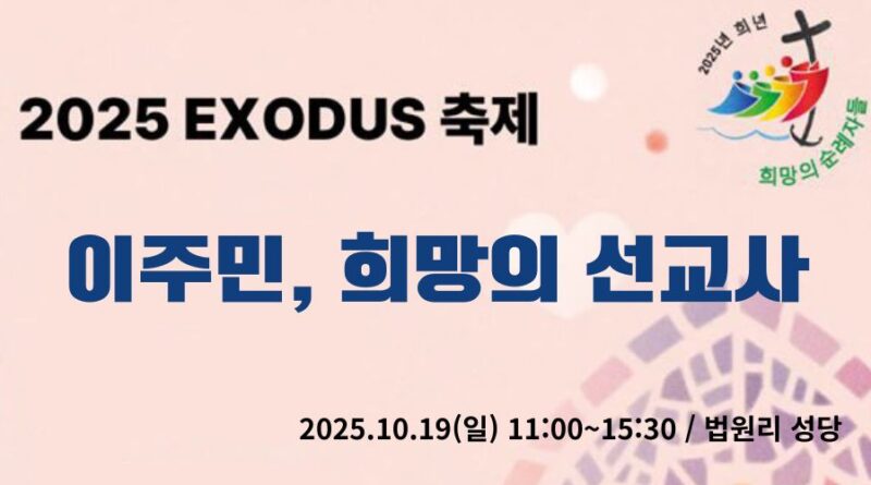 자세히 보기이주민, 희망의 선교사 2025 파주EXODUS 축제 일시: 2025년 10월 19일 (일)오전 11시 ~ 오후 3시 30분 장소: 법원리성당(파주시 법원읍 사임당로