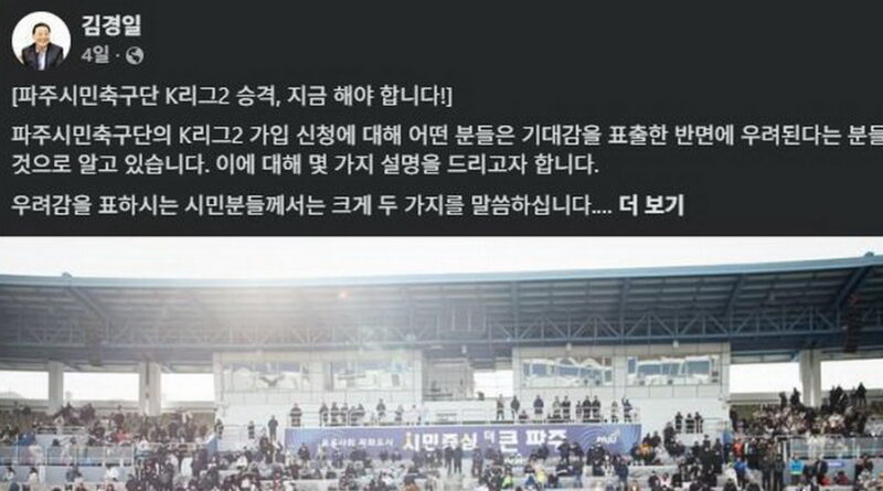 자세히 보기김경일 파주시장은 2025.7.24일 페이스북을 통해 최근 논란이된 파주시민축구단 k리그2 승격은 추진되어야 한다고 주장했다. 종전 파주시의회에 답변한 내용과 크게 다르지 않지만